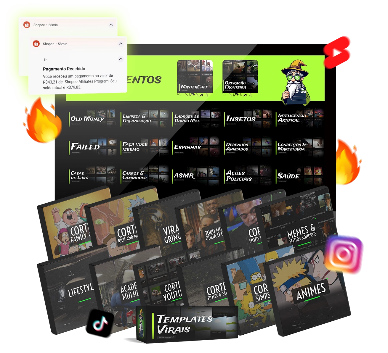Mais de 50.000 Cortes + Templates Virais e Mini Curso em Vídeo ensinando como usar, adaptar e postar com segurança. Estrutura pronta para começar hoje. APENAS R$19,90!