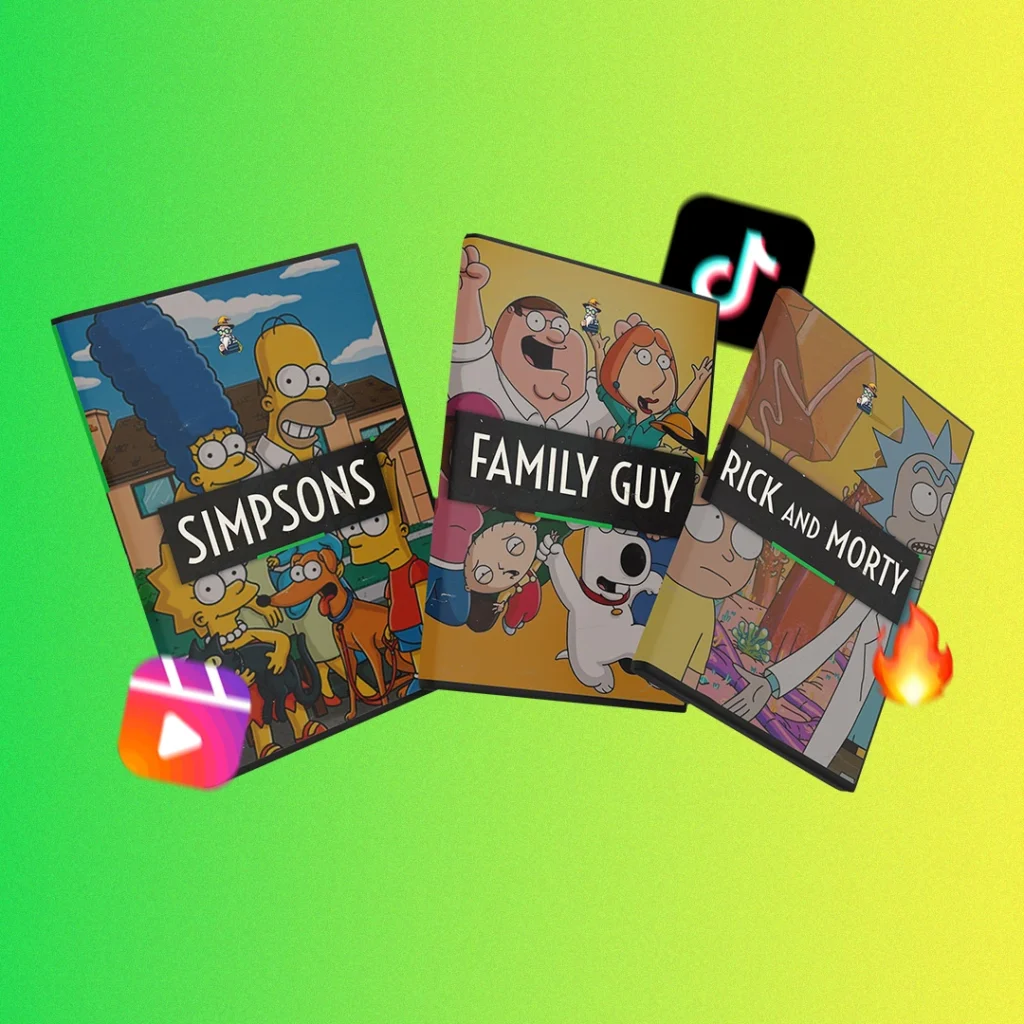 Simpsons, Family Guy e Rick and Morty reunidos em mais de 500 cortes limpos, focados no nicho de desenhos com sátiras que geram alto engajamento e viralizam fácil no TikTok, Reels e Shorts.